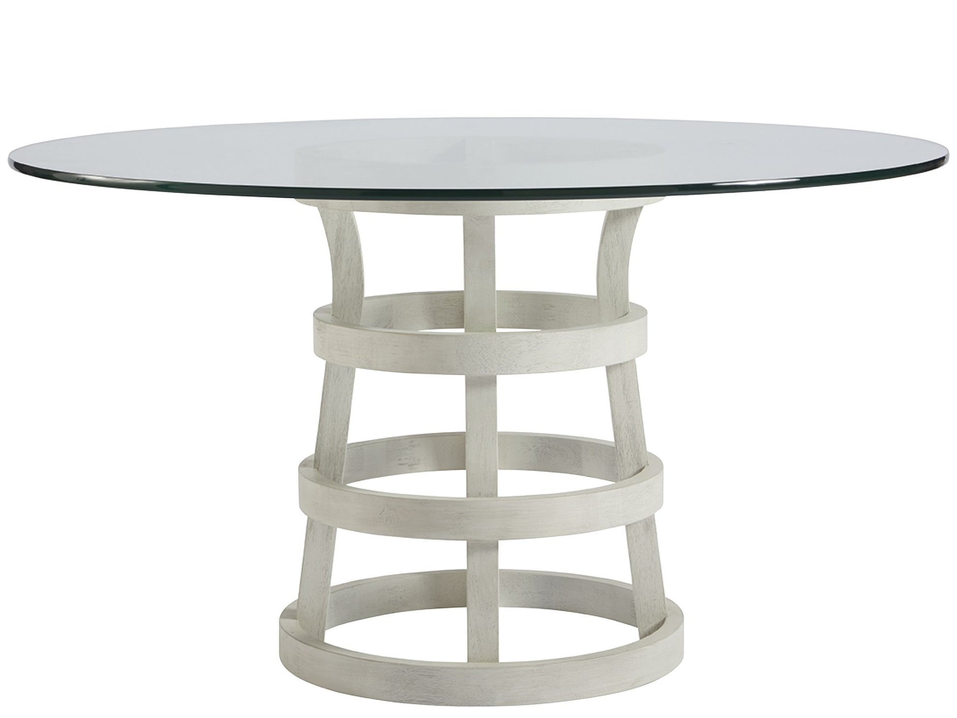 The Escape Dining Table creates a joyfully light focal point in spaces with a circular glass top supported by a unique, open-air base design in a smooth Sandbar finish. Glass top available in either 44Ó or 54Ó.