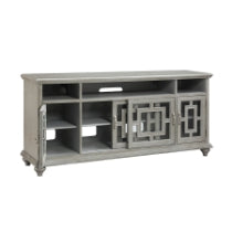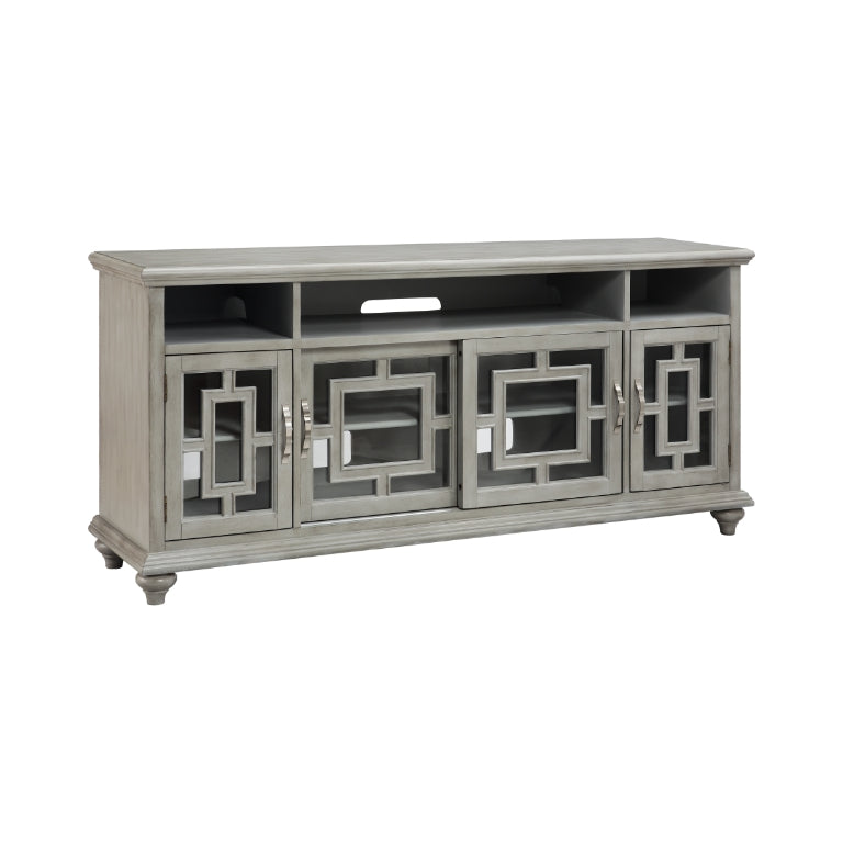 Four-door media console with three open compartments. Three adjustable shelves and wire management between open compartments and on back panel. Hand-painted cloudy gray finish.