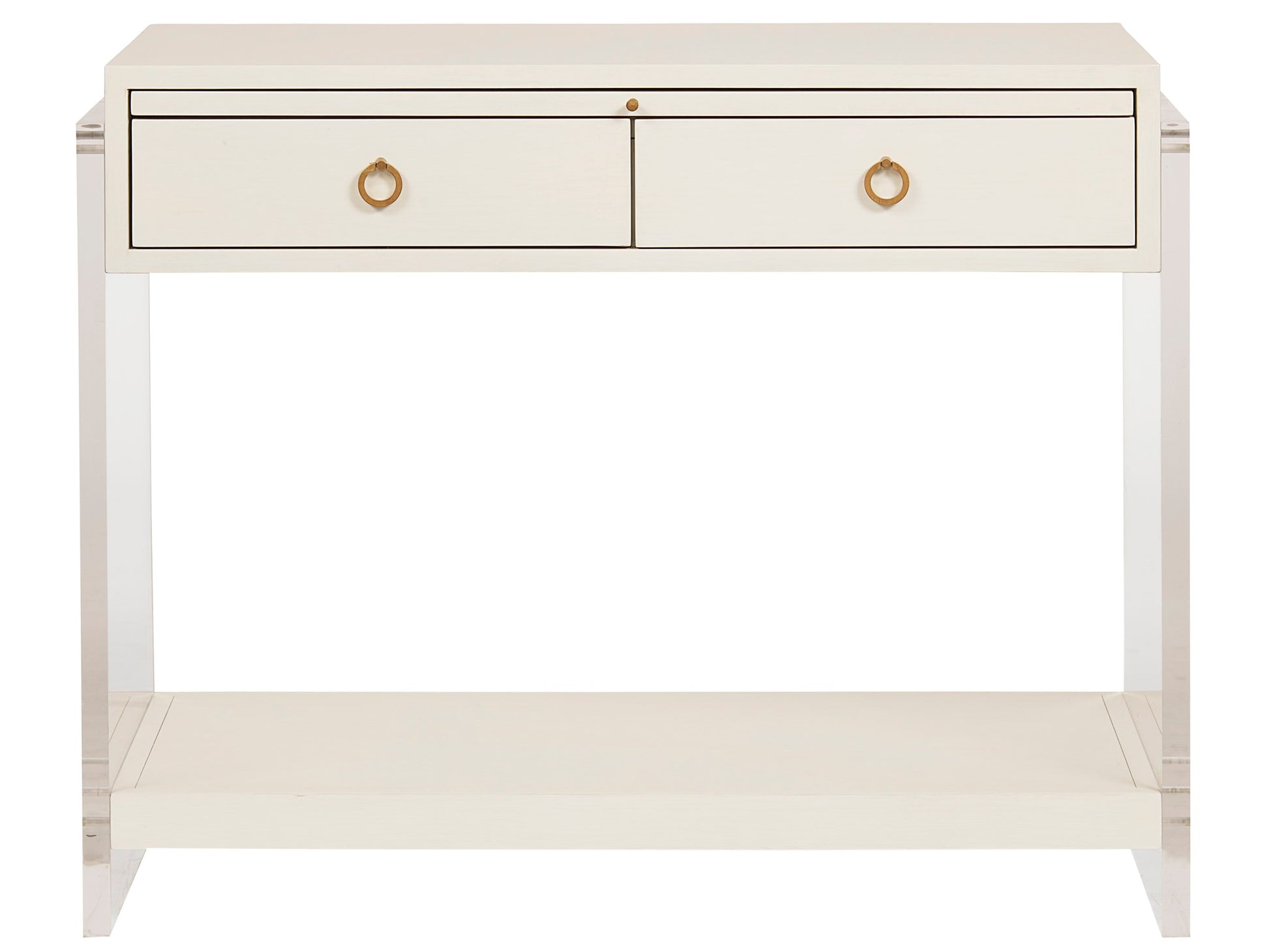 Showcasing classic coastal style with a modern twist, the Belize Nightstand brings a lightness to spaces with two drawers, open-air storage, bronze ring pulls, and as-sleek-as-can-be acrylic ends complemented by a white finish
