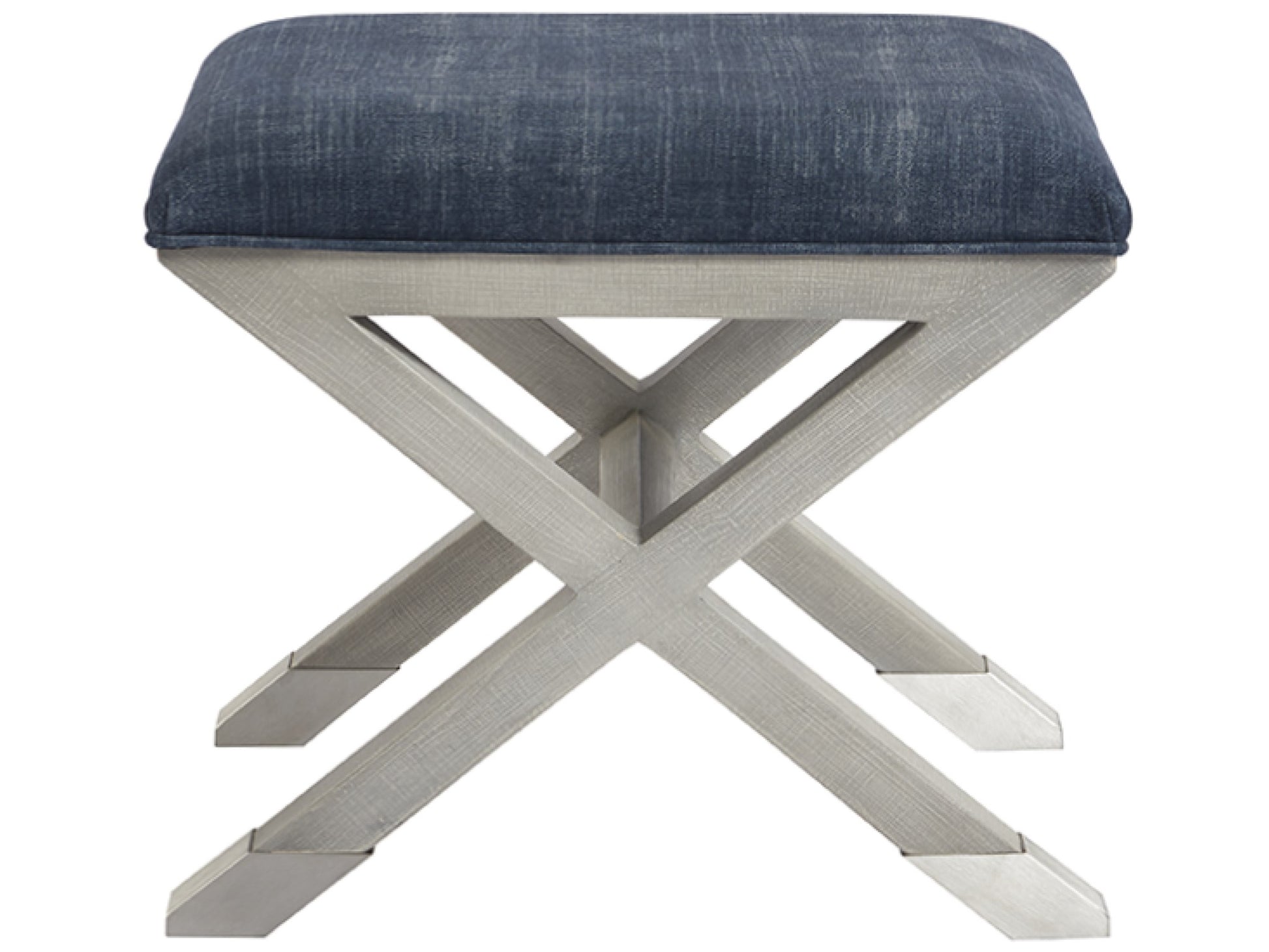 A denim suede upholstered seat is supported by a base finished with sleek metal caps to complete the Escape Bench, a stylish comfort piece perfect for any area of the home.