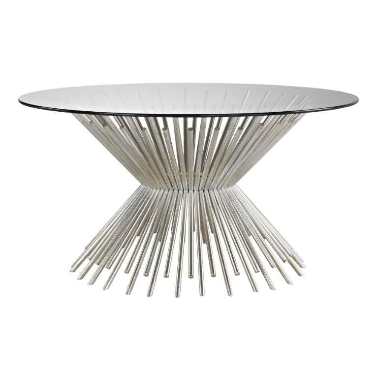 Utterly unique and always bold, Machine Age - Art Deco design stories mean the flawless synthesis of the lavishness, optimism and sturdiness distinctive to history's bourgeoning industrial epoch. Our beautifully handcrafted Brussels Coffee Table blends the hallmark exuberance of the Deco Lightburst motif with a gorgeous Champagne Gold color story and durable metal with tempered glass construction.
