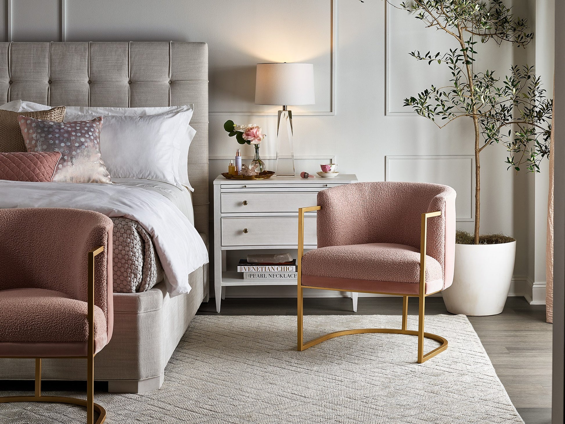 A stunning blush fabric and a soft gold metal frame joyfully blend together to create the Cali Accent Chair, a plush yet contemporary comfort furnishing.