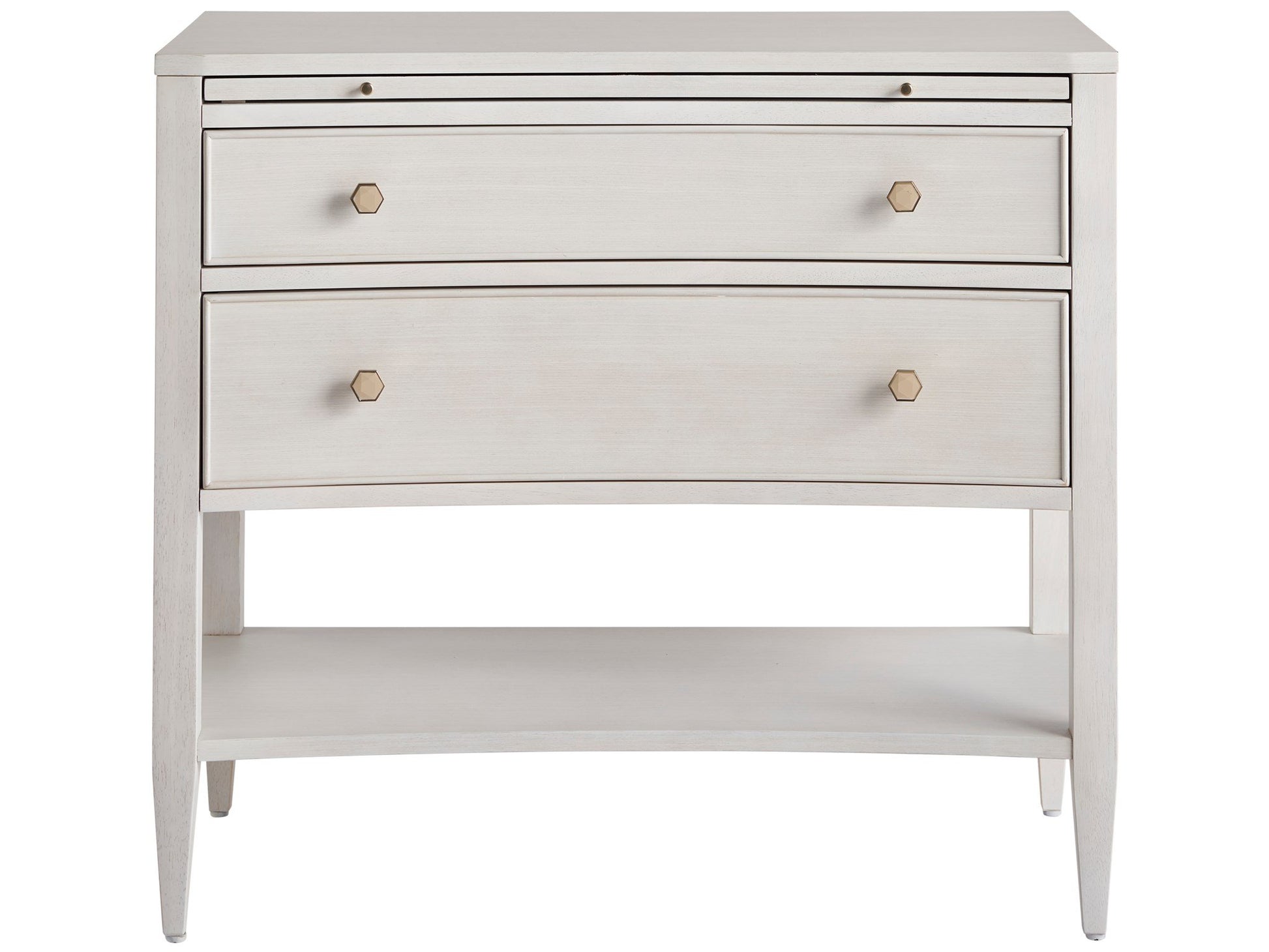 Wonderfully chic and sophisticated, the Chelsea Nightstand is encased in an Alabaster finish and designed with two drawers, and a laminated pull-out shelf. It is accented with champagne, hexagonal hardware for a simple, streamlined look.