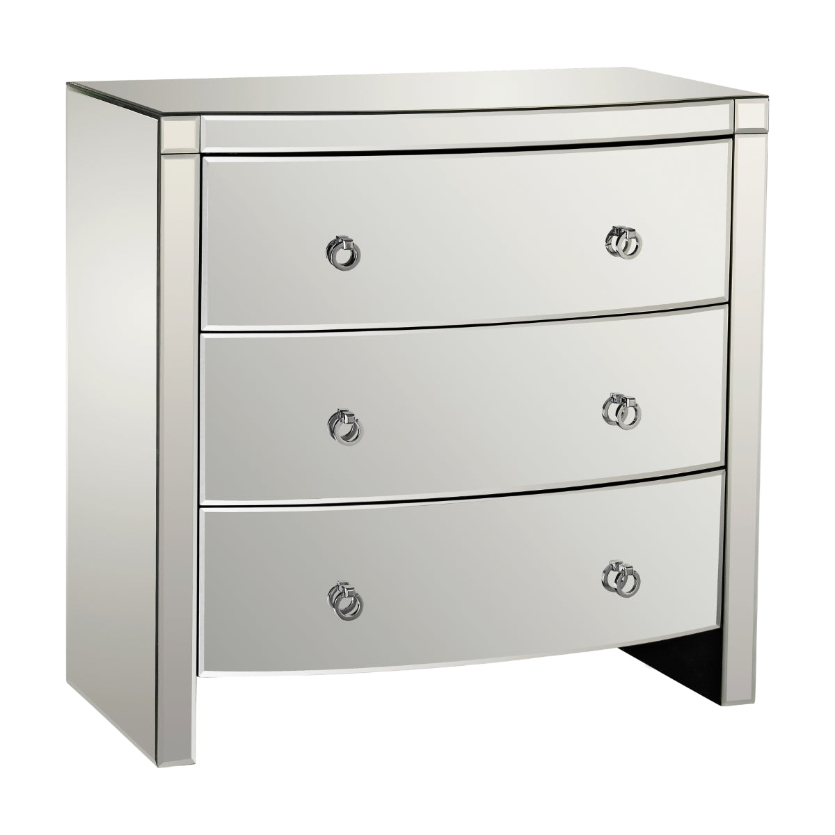 The Claire 3-Drawer Chest marries smartly streamlined Deco styling with the voluptuous shape and pure opulence of mirrored decor. Three generous drawers offer plenty of storage, while a set of stylish but subtle ring pulls complete the look.