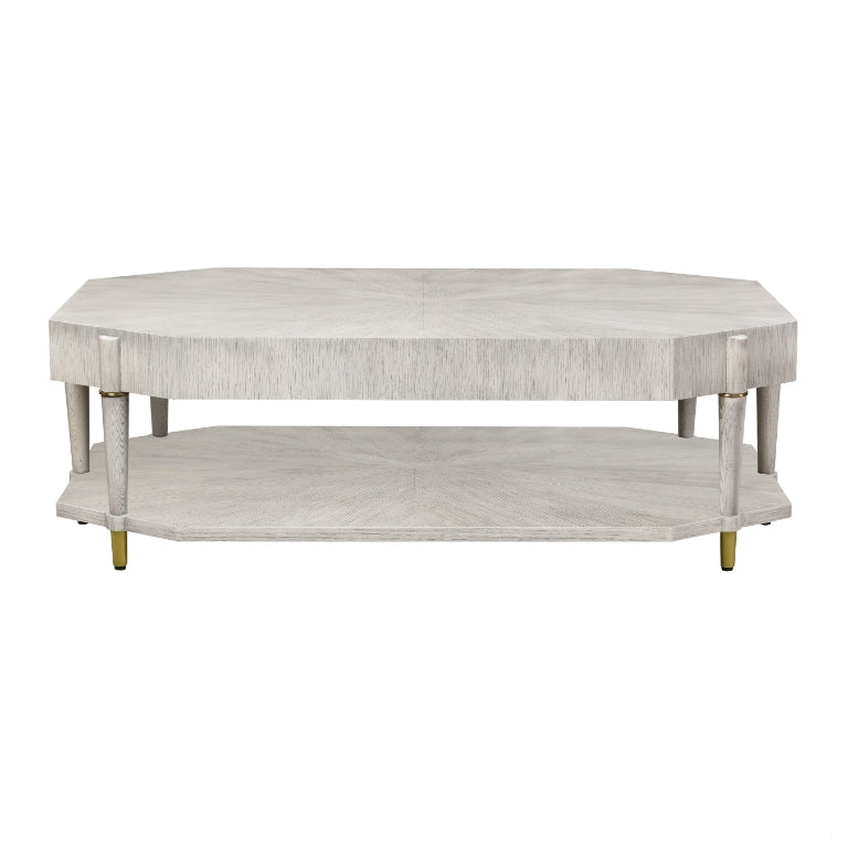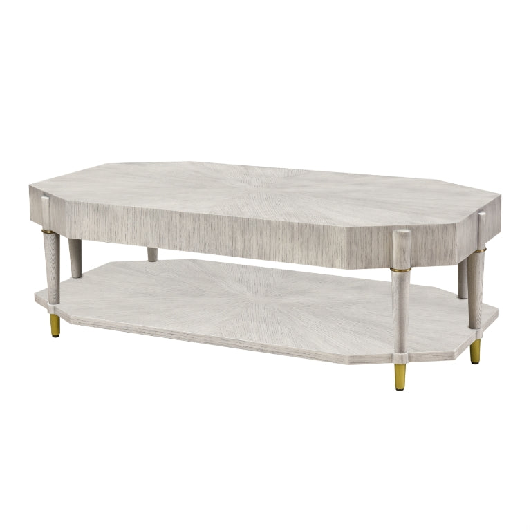 The Colette Coffee Table features a fancy face oak veneer top and apron in a wire brushed aged white finish. Six solid ash wood legs include satin brass detailing and sabots. A lower tier shelf adds additional storage and visual balance.