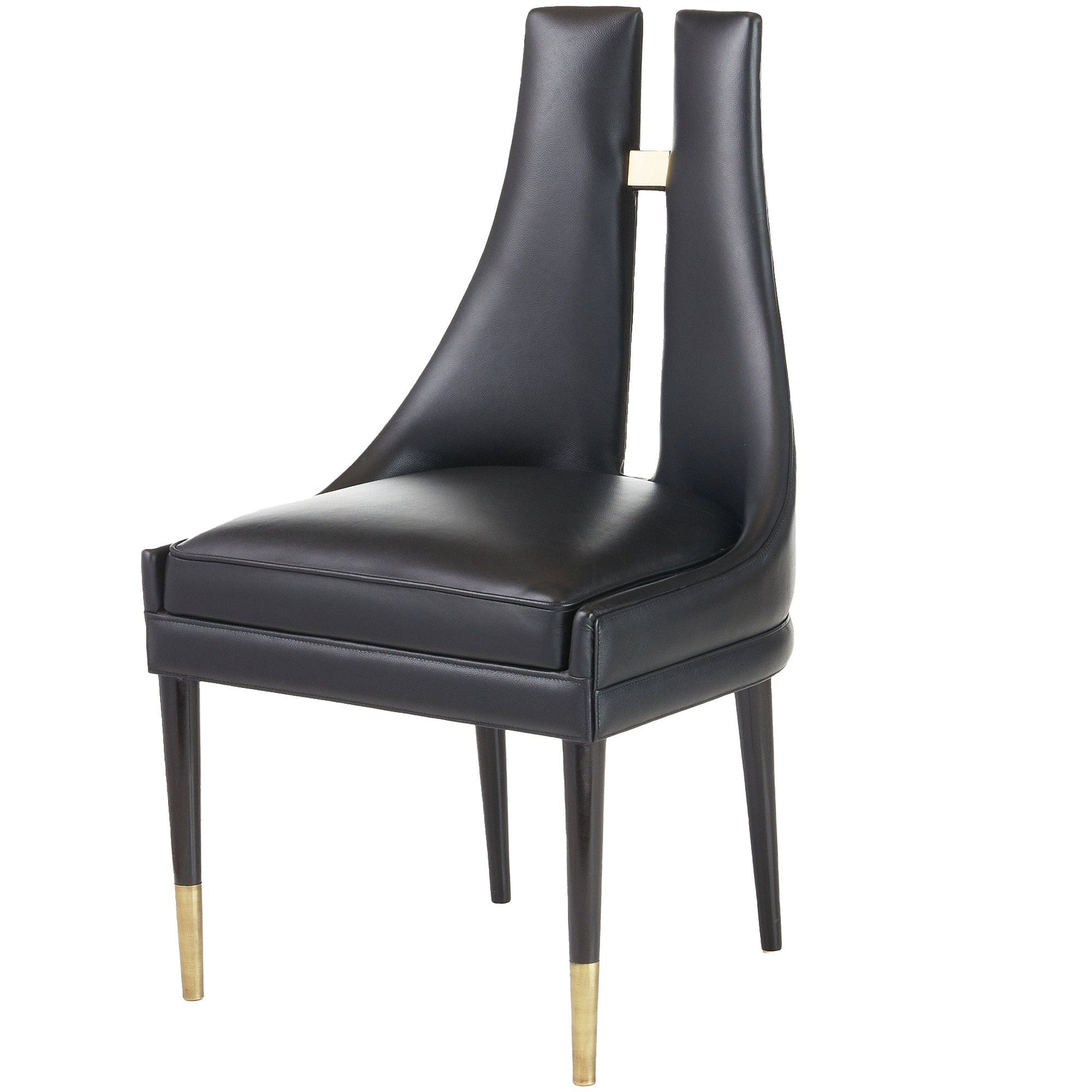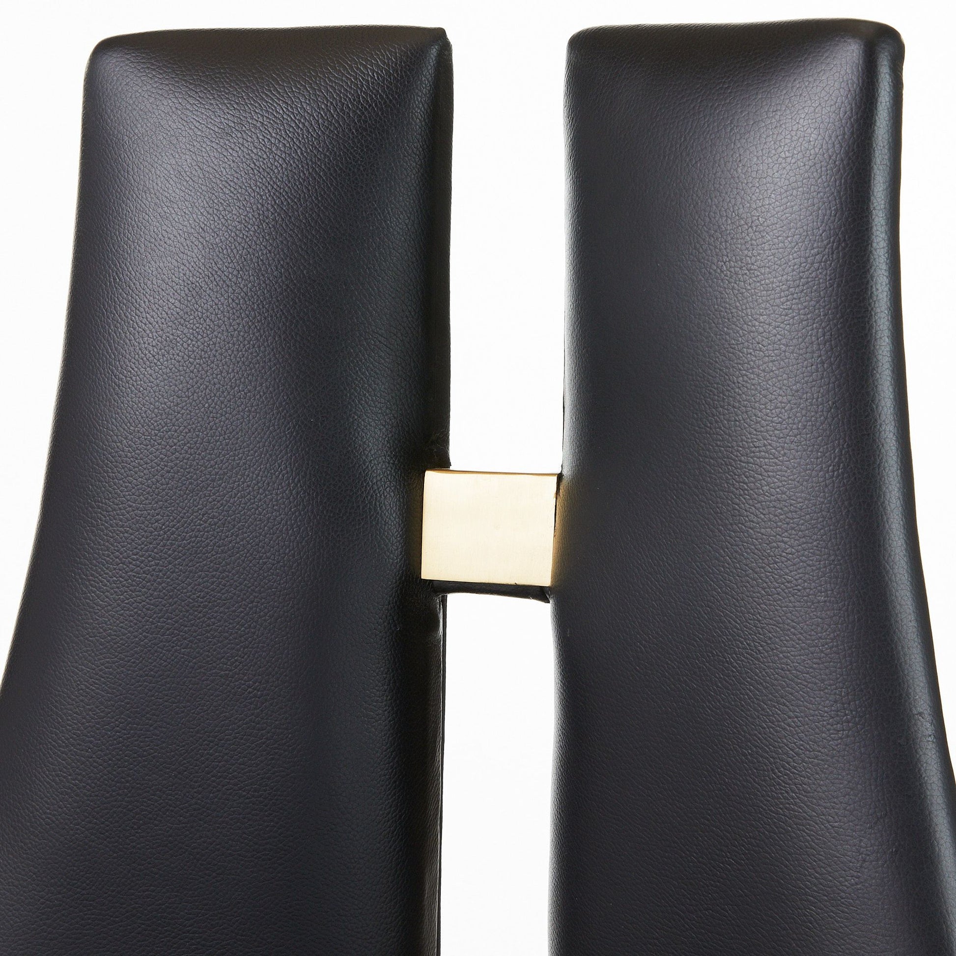 THE IDEAL BALANCE OF MASCULINE AND FEMININE, A SLEEK SLIT DETAIL MIMICS AN ALLURING OPEN-BACKED DRESS. SOFT BLACK LEATHER UPHOLSTERY IS ENHANCED WITH POLISHED ANTIQUE BRASS JOINERY. POISED ON SLIM, EBONY BEECH WOOD LEGS TIPPED IN BRASS. LEATHER WILL VARY.