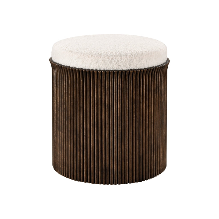 The Daphne Stool has a cylindrical shape made from vertical bronze rods, creating a slightly flared, fluted texture. The round upholstered top is made from white bouclé. The stool looks great in pairs, and is ideal for a vanity stool or accent stool.
