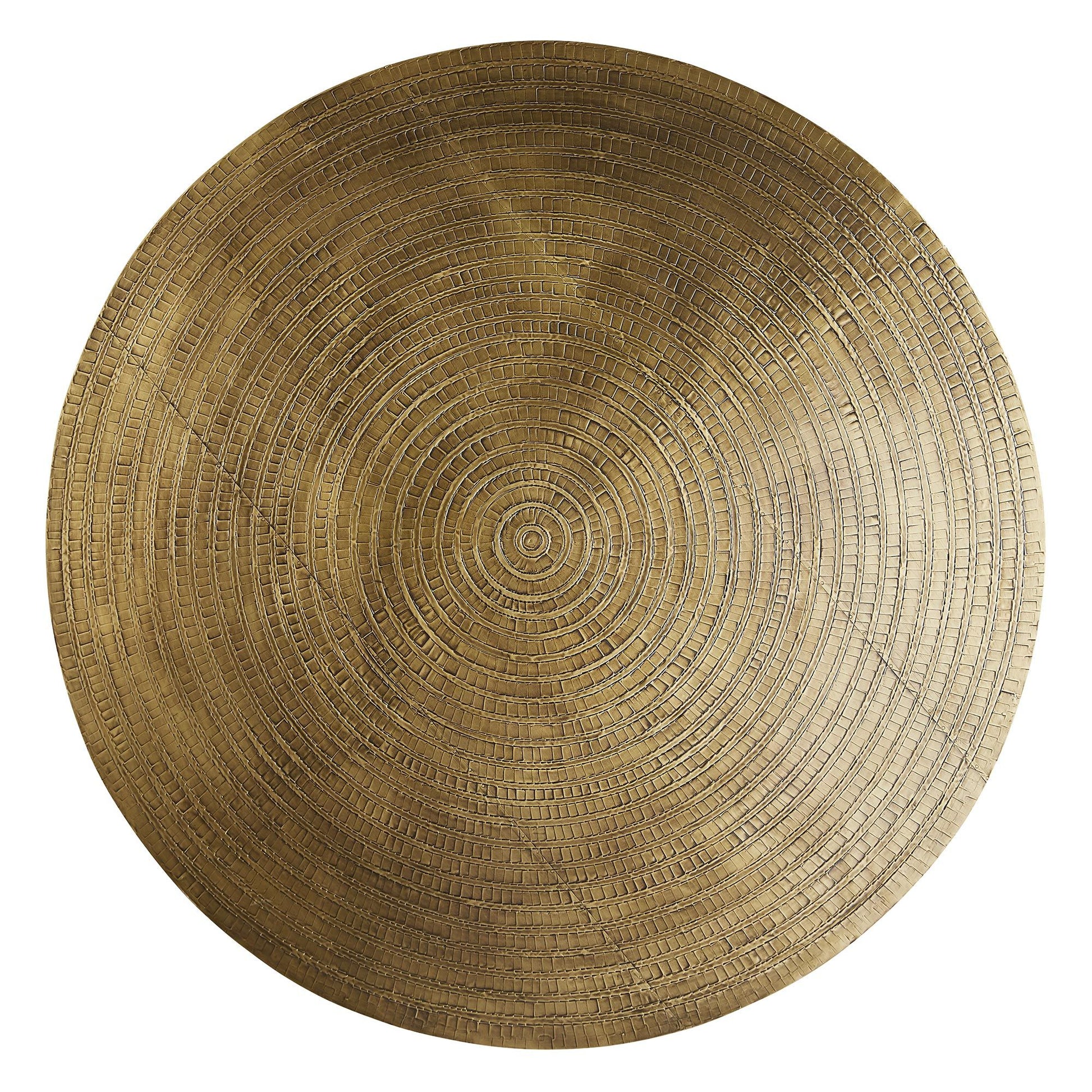 ARTISAN TECHNIQUE TAKES HOLD IN THE COMPELLING DESIGN OF OUR DARYL SIDE TABLE'S COUNTERPART. THE SOLID WOOD TOP HAS BEEN CARVED WITH A RHYTHMIC DESIGN THEN CLAD IN ANTIQUE BRASS SHEET. A SLIM AND SHORT TAPERED ALUMINUM BASE IS FINISHED IN ANTIQUE BRONZE AND WORKS TO COMPLEMENT THE TOP WITH A STRIKING CONTRAST IN COLOR AND MATERIALS. CLAD FINISH WILL VARY.
