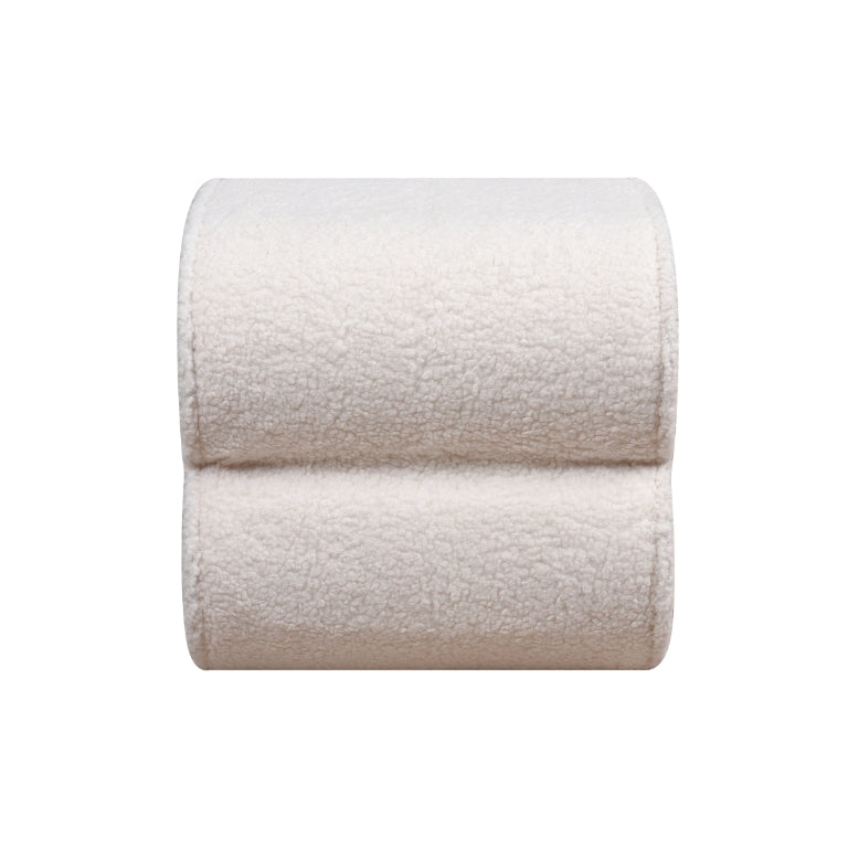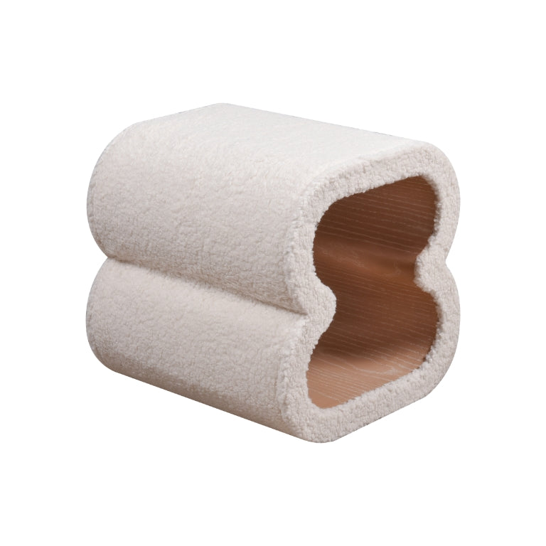 The Dewitt Accent Stool is wrapped in textural white boucle, with a cut out interior finished in oak veneer. The curving, stacked shape has a sculptural, wave-like appeal, ideal for adding visual interest to any space.