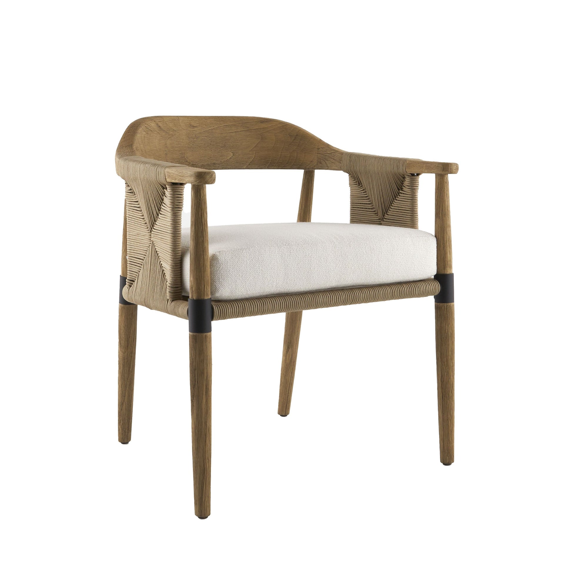 AN INDOOR MID-CENTURY STYLE TUNED UP FOR THE OUTDOORS, THE ESTES DINING CHAIR IS ADORNED WITH UNEXPECTED WOVEN WILLOW SYNTHETIC ROPE ACCENTS ON EACH ARM. CRAFTED OF HONEY-STAINED TEAK, THE LOW-BACKED FRAME HAS TAILORED METAL BLOCK ACCENTS OF BLACKENED BRONZE CUFFS ON EACH LEG. TOPPED WITH A CUSHION OF OUR PEARL OUTDOOR PERFORMANCE BOUCLÉ. FINISH WILL VARY.