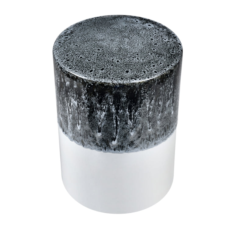 The Gallemore Stool is a versatile earthenware drum stool that can be used as seating or as a tabletop. The stool is finished with a hand-applied black and white crackling glaze that drips from the top to the center where it meets a white ceramic base.