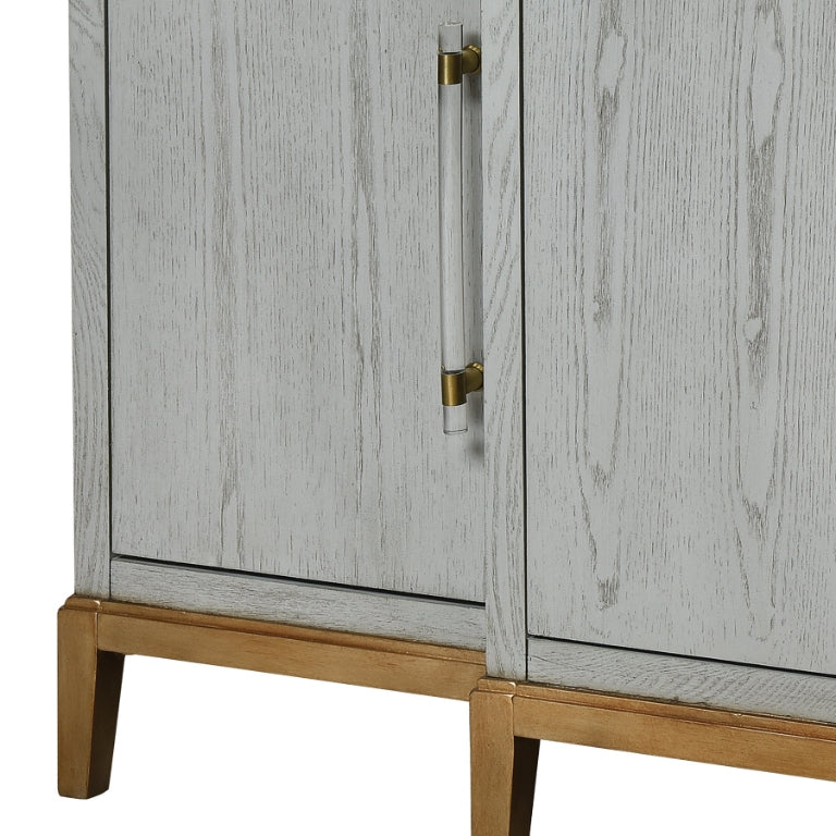 The Geneva Credenza has a grey painted ash finish and vertical acrylic handles cuffed with bronze-finished metal. Its two center doors extend a few inches forward, adding a few inches of crucial depth to its inner shelves. The base has a natural wood finish for a touch of warmth.