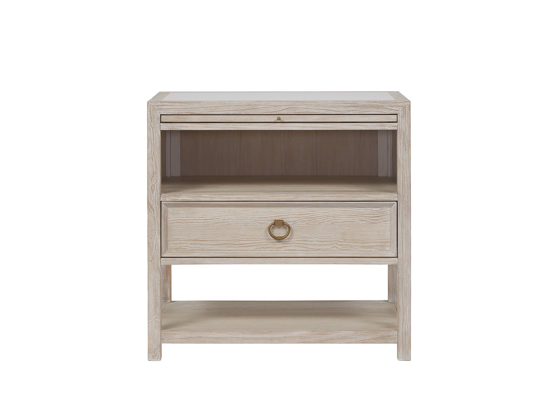 The perfect bedside companion, the Getaway Drawer Nightstand marries the best of function and coastal style with open-air storage, a spacious drawer, smooth stone inset top, pull-out shelf and bronze ring pull hardware