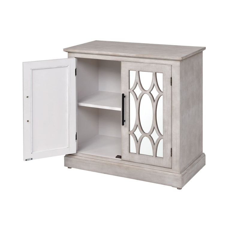 The Hardy collection of cabinets are designed with a transitional tone, complementing traditional aspects of interior decor, while lending an updated twist with on-trend finishes and mirror paneling. The 2-door cabinet houses an internal fixed shelf and comes in an exterior cream finish, fir veneer, with an off-white interior.