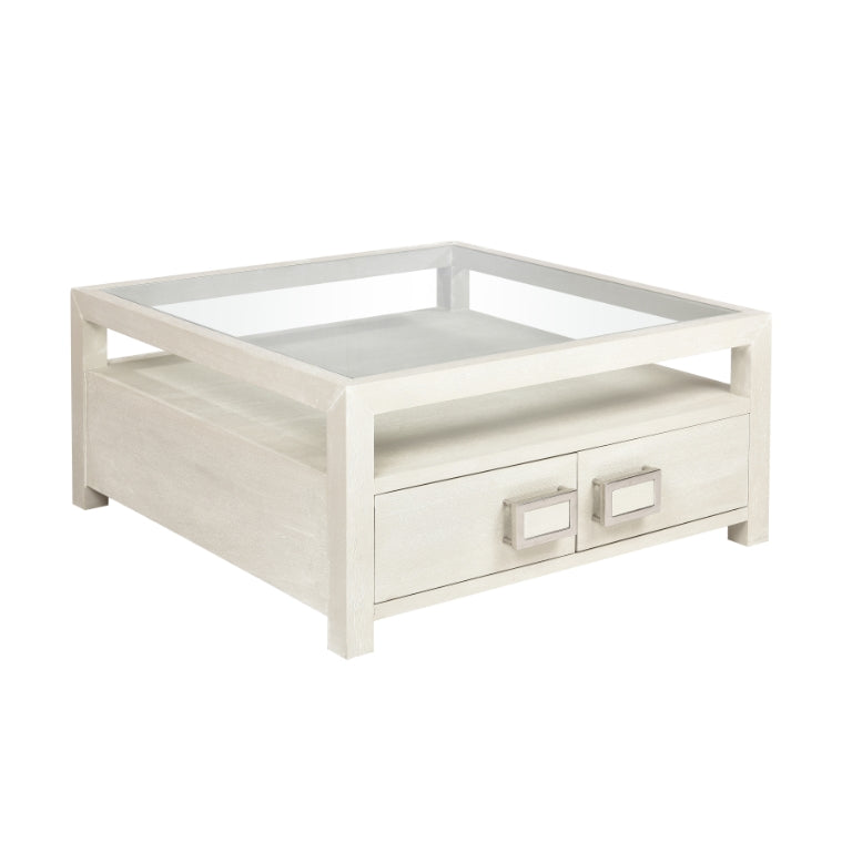 The Hawick Coffee Table is a striking two-door storage table made from ash solids and veneer with a painted finish. The top is made from clear tempered glass, and a lower shelf above the storage doors offers an additional display surface. Each door features a central metal rectangular door handle with a center panel made from cerused wood.