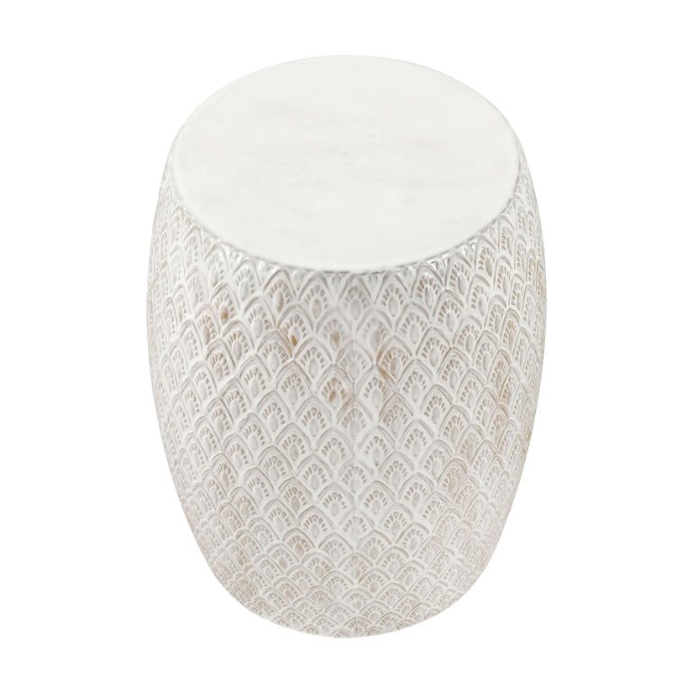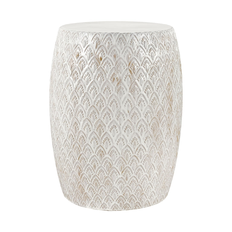 The Hollywell earthenware stool is perfect for bringing delicate texture and fresh color, not to mention versatile seating, to a deck or patio. The drum-shaped stool features a petal inspired, textured motif that is finished in an aged white glaze.