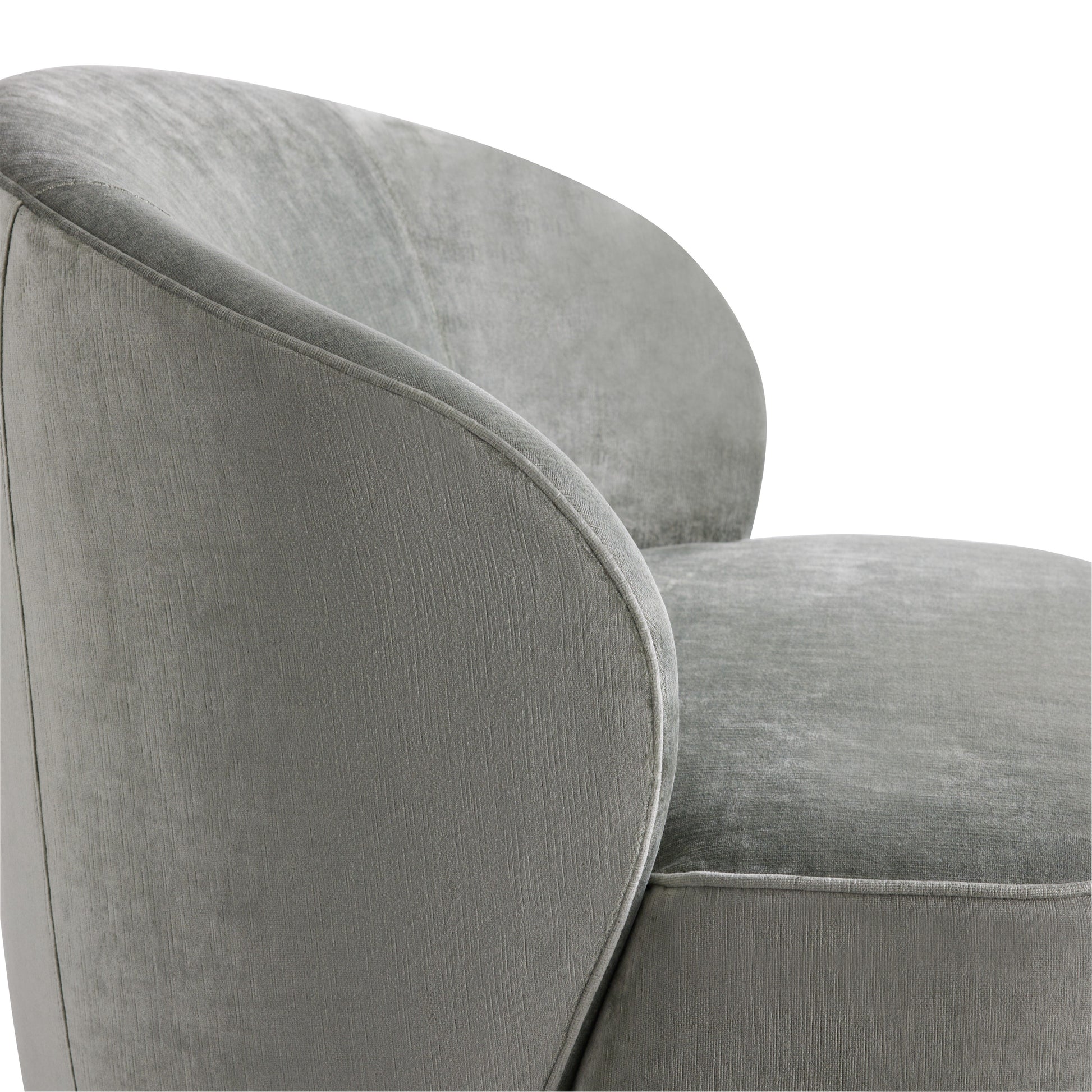 ELEGANTLY SHAPED AND PERFECTLY PROPORTIONED, THE KAITLYN SWIVEL CHAIR DRAWS ATTENTION IN ANY ROOM. A SUBTLE WINGED BACK WRAPS AROUND THE SEAT, CREATING GRACEFUL CURVES THAT ADD LUXURIOUS DETAIL TO ITS BARREL DESIGN. FULLY UPHOLSTERED IN A PLUSH MIST VELVET, THE CHAIR RESTS ON A BLACKENED IRON SWIVEL BASE FOR ADDED FUNCTION.