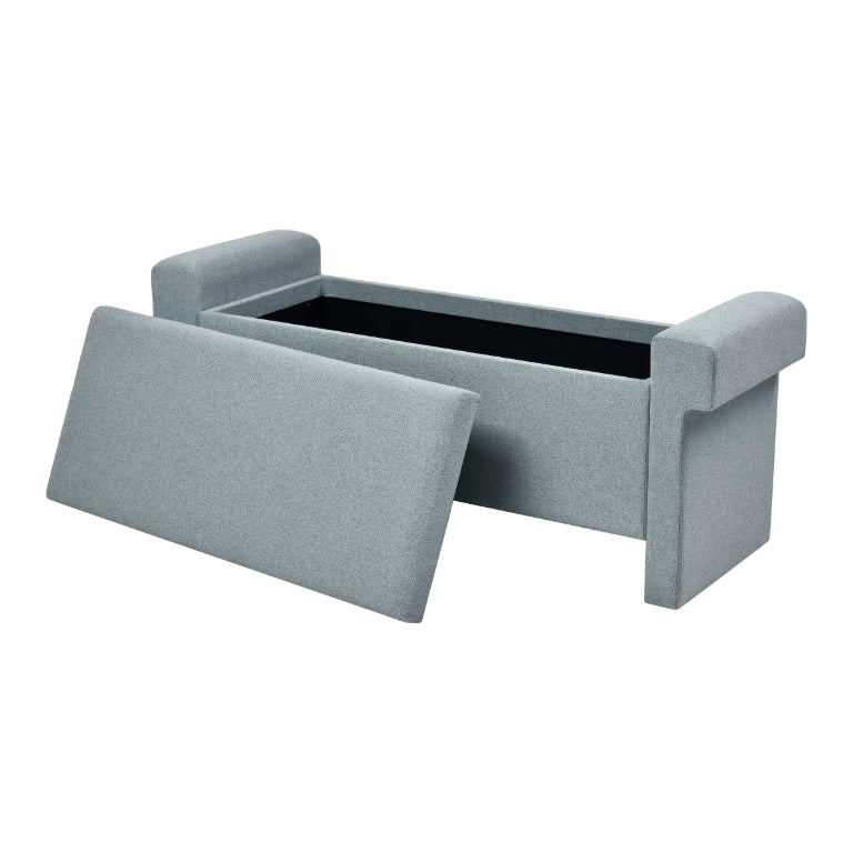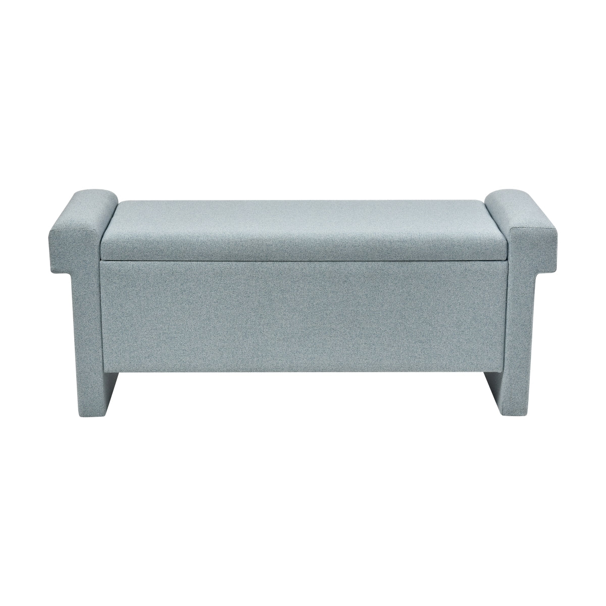 The Ken Bench is a fully upholstered soft blue linen bench with storage inside. The angular silhouette offers an updated traditional look, making it the perfect piece for an entryway, hallway or living room.