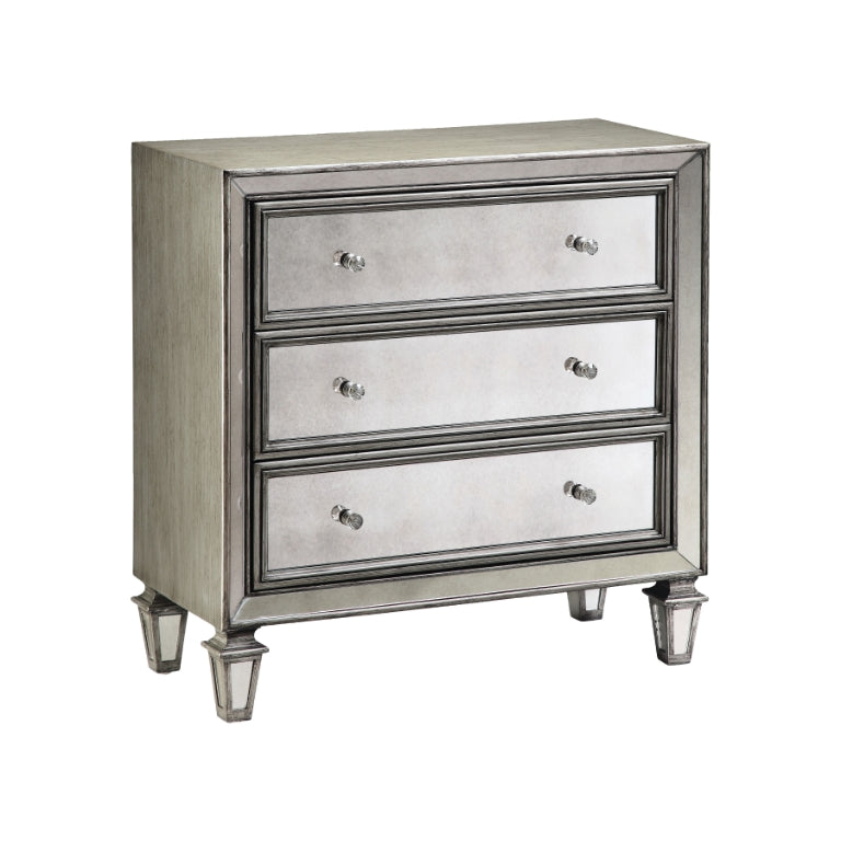 The Lana 3-Drawer Chest is full of elegance, yet small in footprint. This antique-mirrored accent piece will fit in anywhere. It offers three storage drawers, cut-crystal hardware, mitered corners, a hand-painted silver-gray finish and a timeless silhouette.