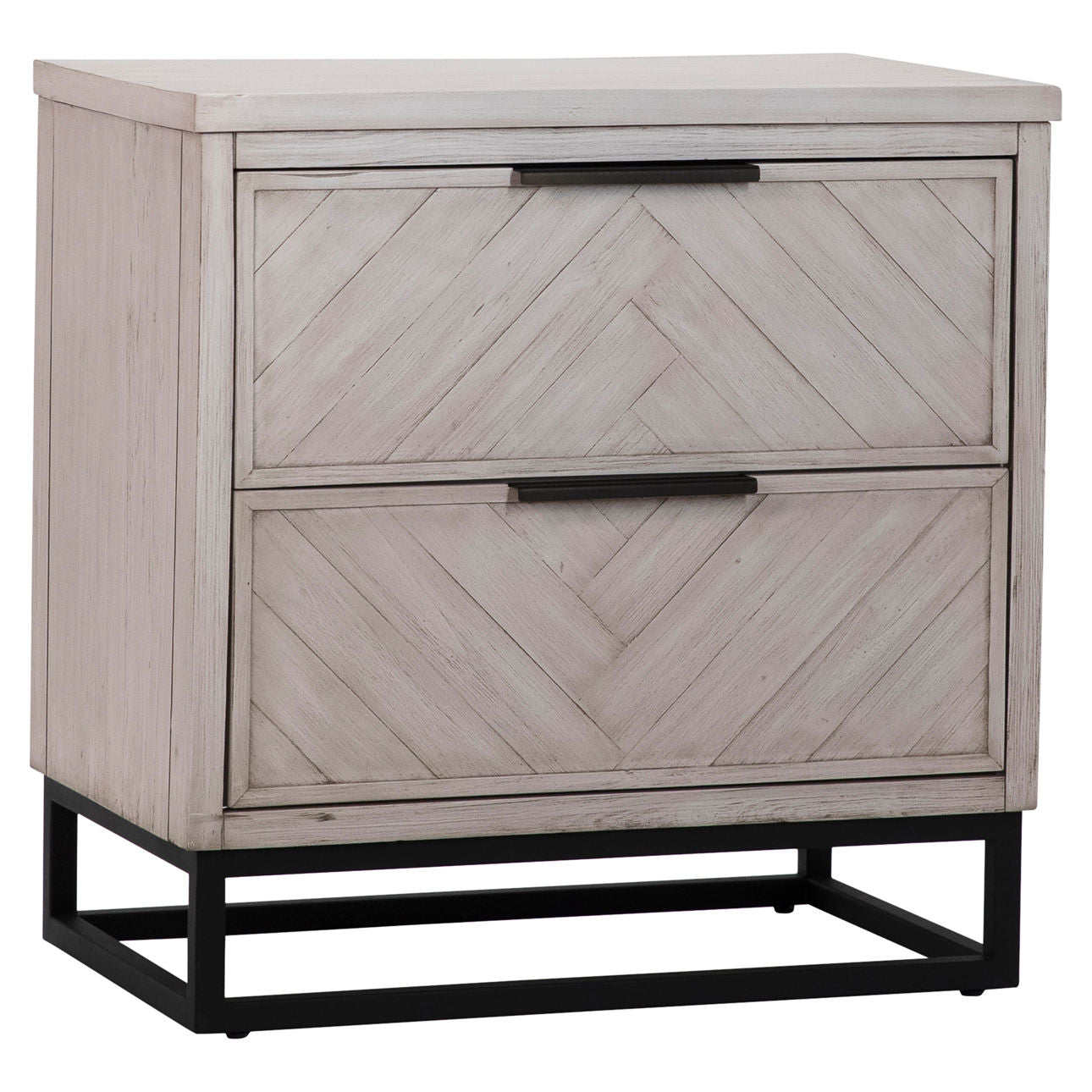 Combining the best of modern and industrial styles. This 30" nightstand pairs reclaimed acacia wood in a light grey wash finish with black metal for a cool, modern look. Featuring a subtle herringbone design and two spacious drawers that roll open on metal slides. They are accented with sleek black metal handles for rich color contrast that match the metal base.