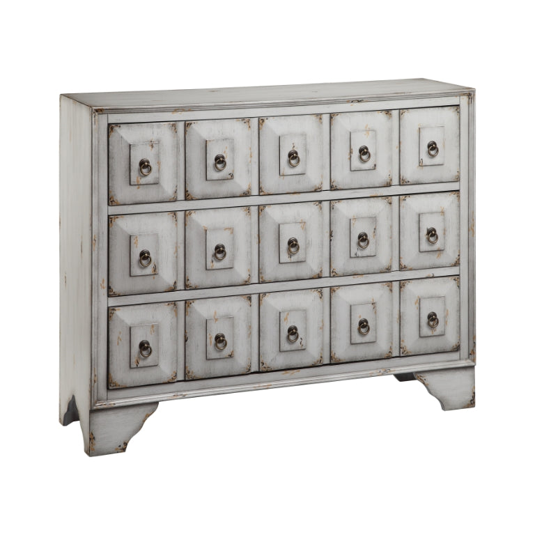 The Mohala Chest is an apothecary style storage piece featuring a hand-painted Aegean Mist grey finish. Each of the three drawers feature five faux square drawer fronts with drop-ring pull hardware.