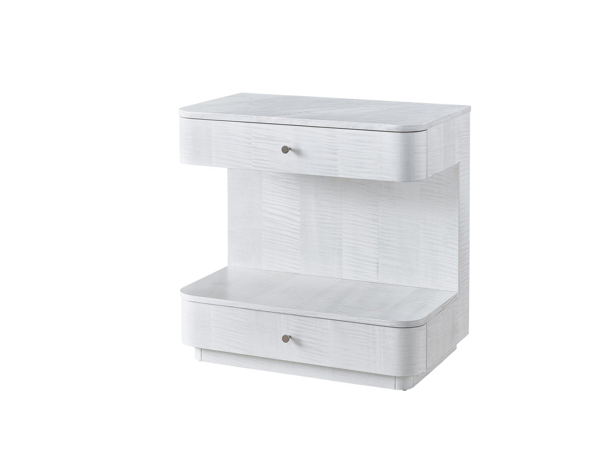 Elevate bedsides with the imaginative Paris Nightstand, a stylish twist on a retro look featuring two drawers, white marble tops and a lavish white sycamore finish.