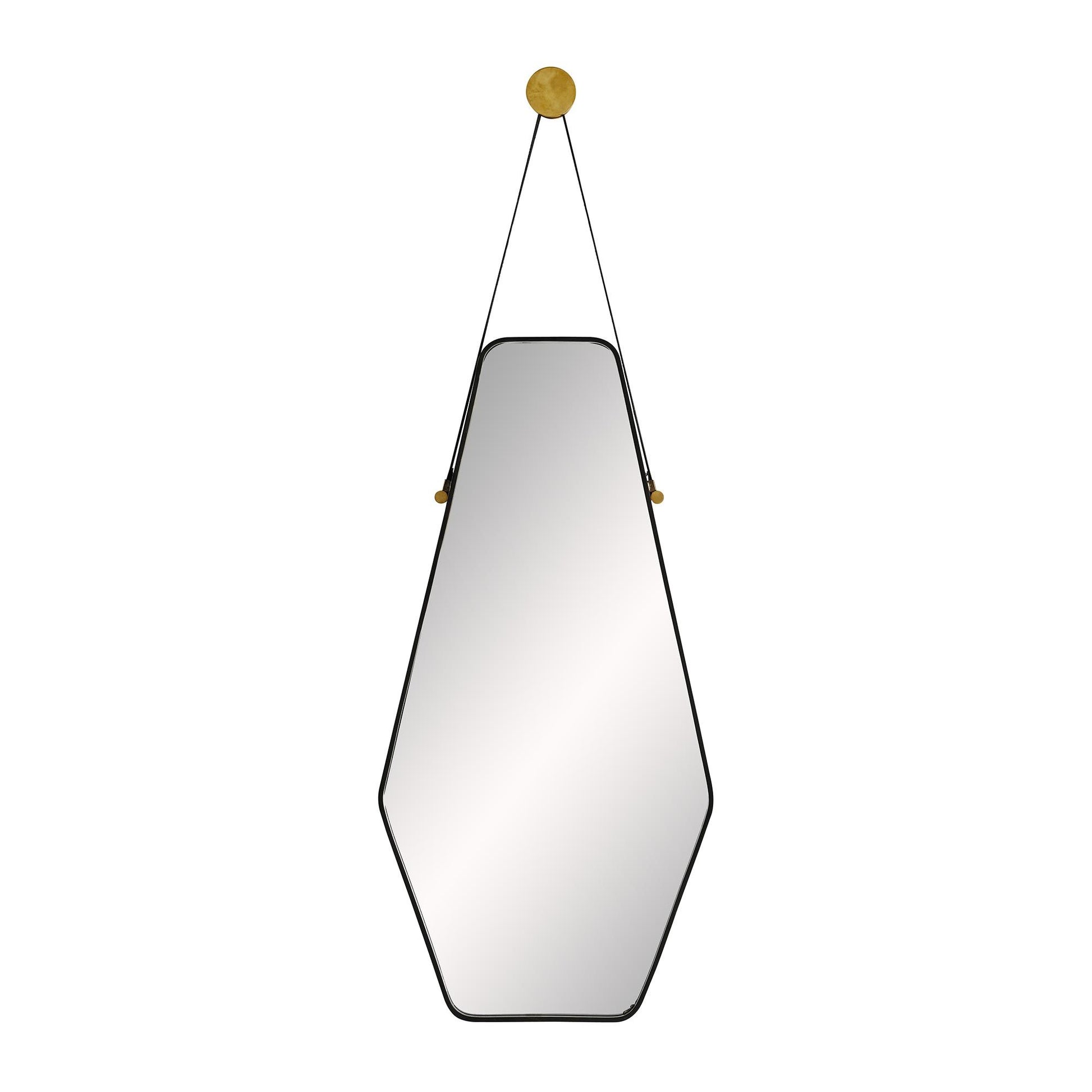 GEOMETRIC DESIGN AND MINIMALIST STYLING GIVE THIS SIMPLE, CHIC MIRROR MODERN SOPHISTICATION. A FRAMELESS, IRREGULAR HEXAGON IS SUSPENDED FROM AN ANTIQUE BRASS MOUNTING HOOK BY A STRAP OF BLACK LEATHER. THE PLAIN GLASS MIRROR IS MOUNTED ON A THICK ANTIQUE BRASS BASE, SO IT IS RAISED ABOUT 2 INCHES FROM THE WALL, CASTING A SLIGHT SHADOW AND ADDING DIMENSION TO A WALL SPACE. THE NARROW PROFILE WORKS WELL IN A DRESSING ROOM OR POWDER ROOM AND LOOKS EXTRA-SLEEK WHEN HUNG IN A SERIES.