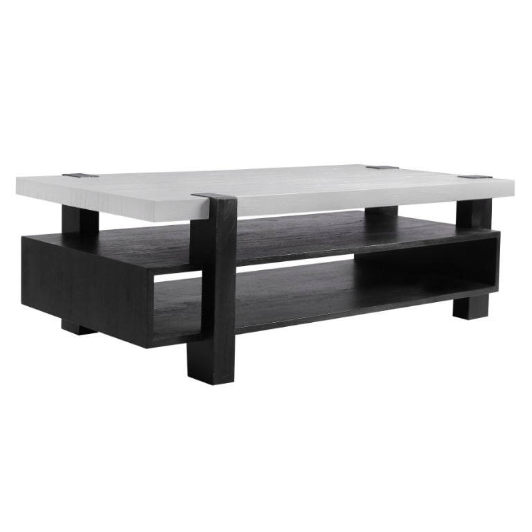 The Riviera Coffee Table is a two-tone rectangular table with a checkmate white top and black base. A black band wraps around the table legs, providing a sculptural element and enhancing the silhouette. This table is ideal for modern living rooms and seating areas.