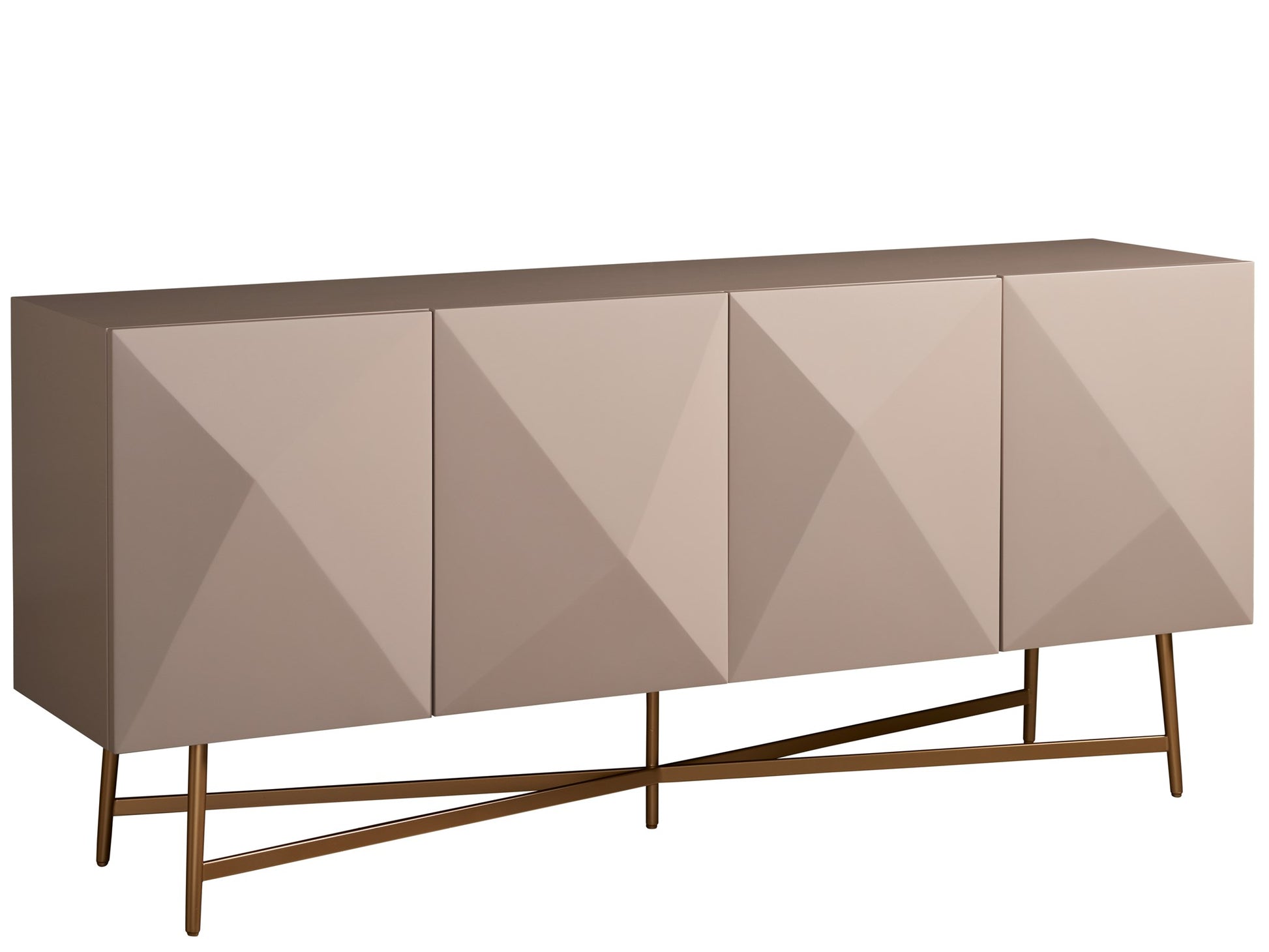 Bold and elegant, the Runway Console offers a complete storage solution with 4 doors, adjustable shelving, and wire management; all encased in a chic taupe lacquer finish.