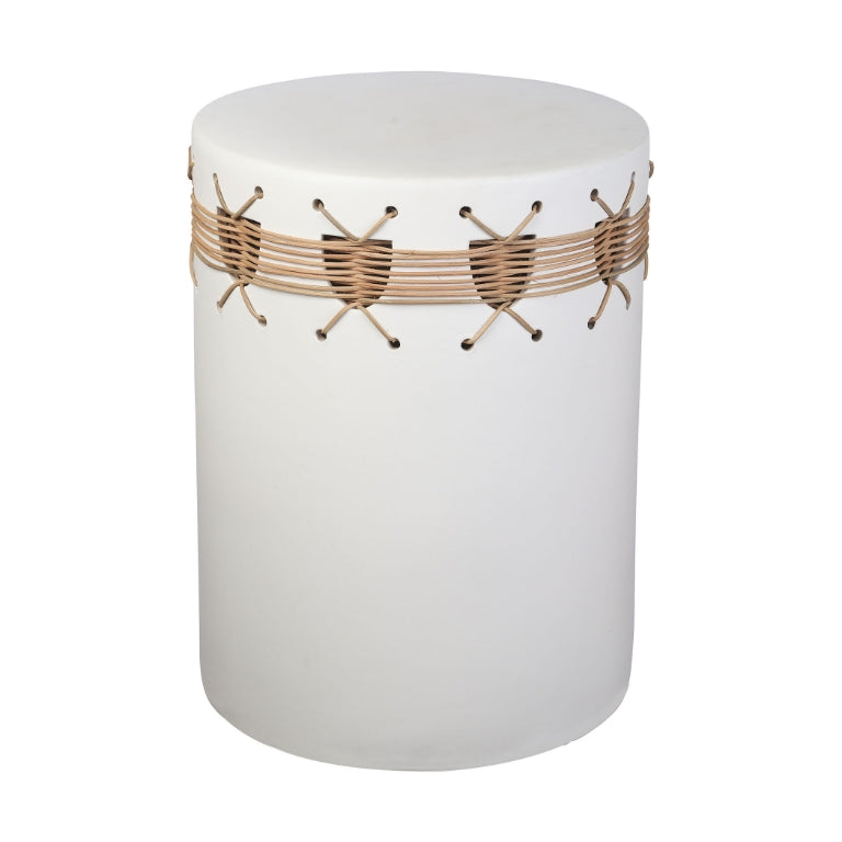 The Sabira earthenware stool features a drum shape with an aged white finish and natural woven detailing. Designed for modern or organic inspired spaces, this piece features cut out handles on its sides for easy portability.