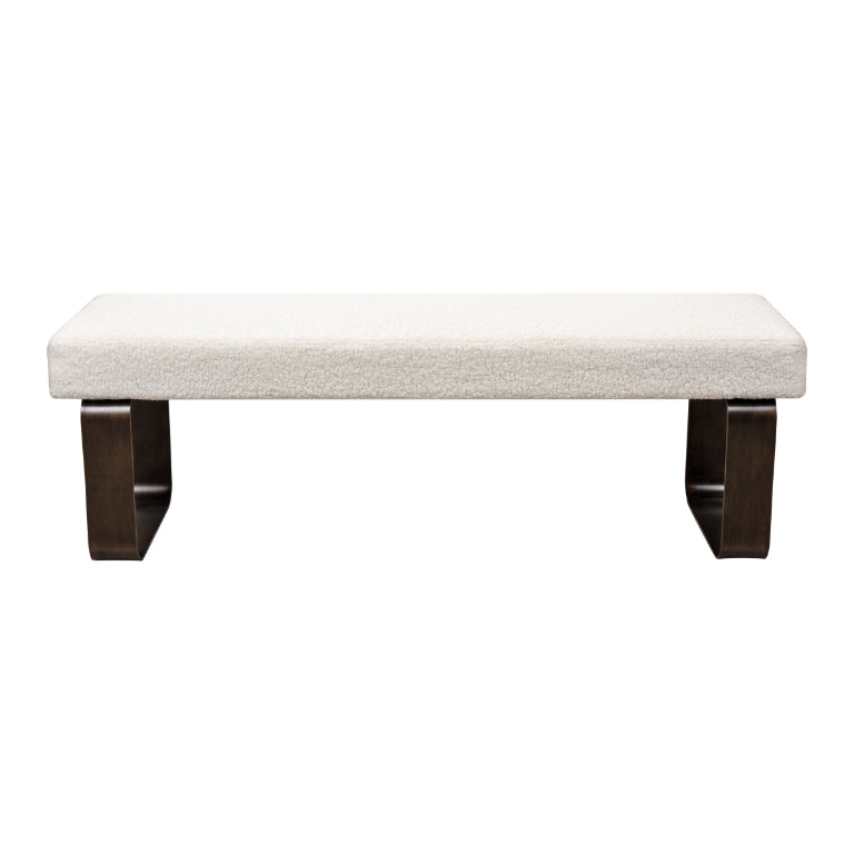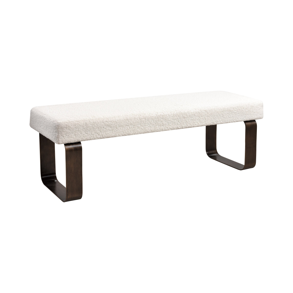 The Sander Bench has a textural upholstered white boucle seat. For the base, two flat bands of aged bronze finish metal wrap into squares, providing support at either end. This bench is ideal in an entryway or bedroom.