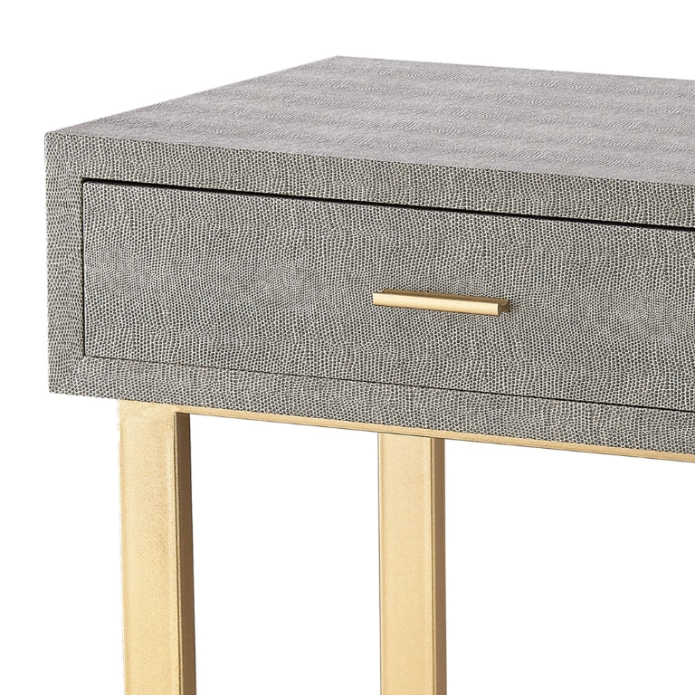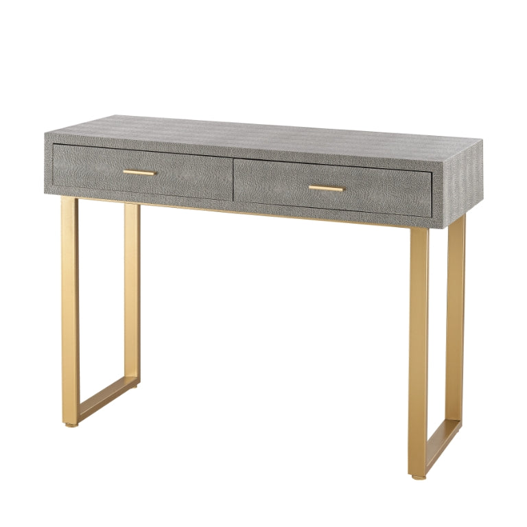 The Sands Point Desk is a chic shagreen wrapped rectangular desk with two drawers and an open frame base. The top with drawers is wrapped in grey faux shagreen. The open sided frame means that this useful and elegant desk is versatile and stylish, making it perfect for a vanity or home office.