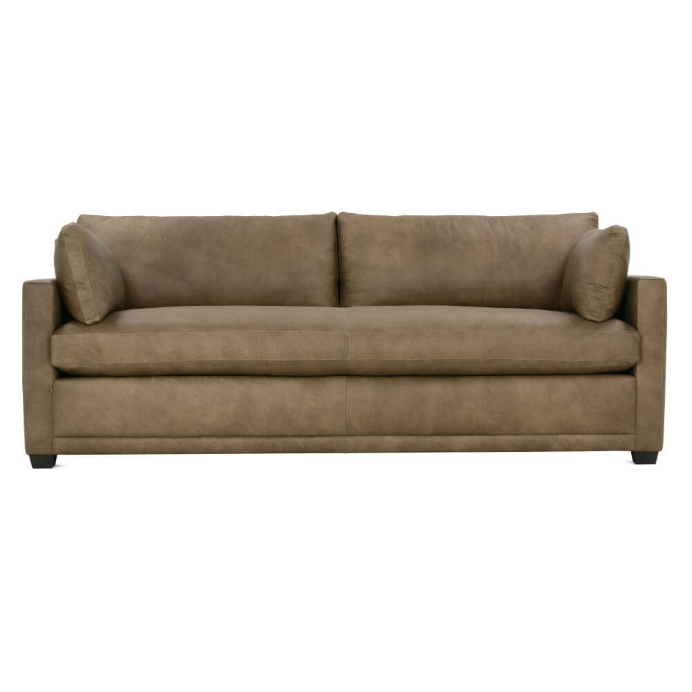 The Sylvie Leather Sofa is designed with comfort, clean lines, and updated styling in mind. Featured in our Athena Mushroom leather and carob wood finish.