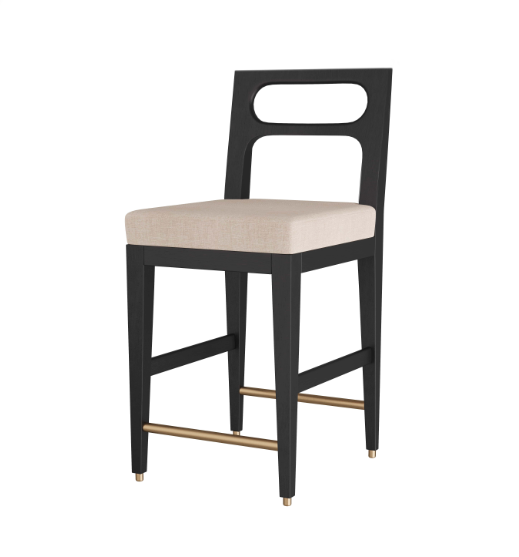INSPIRED BY MIDCENTURY, ITALIAN, LADDER-BACK CHAIR CONSTRUCTION, OUR THADEN COUNTER STOOL IS REIMAGINED WITH THOUGHTFUL DETAILS AND SOFT, MODERN CURVES. THE SIMPLE, YET ELEGANT, CHAIR IS CRAFTED IN EBONY MANGO WOOD, WITH TAPERED LEGS, AND WITH A NATURAL LINEN SEAT. RECESSED SABOTS AND A STRETCHER IN ANTIQUE BRASS COMPLETE THE PIECE. FINISH WILL VARY.
