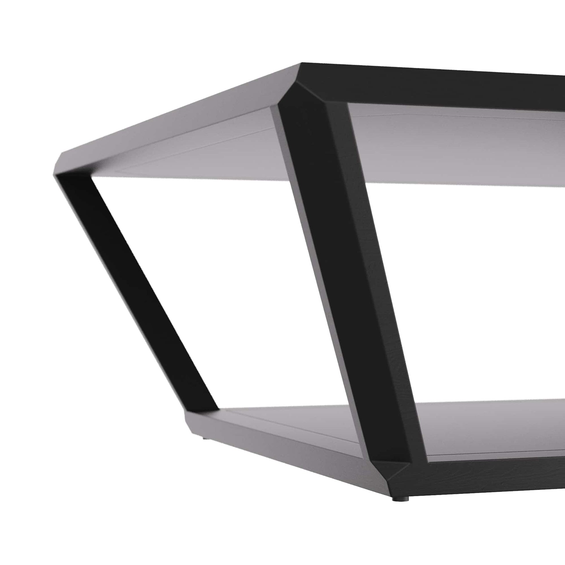 INSPIRED BY FACETED, EMERALD-CUT STONES, THE WELBOURNE COCKTAIL TABLE IS A FINE EXAMPLE OF FORM UNITING STYLISHLY WITH FUNCTION. THE OPEN DESIGN, CREATED IN EBONY WALNUT VENEER, PLAYS TO THE SYMMETRY OF ITS ANGULAR FORM. A SURFACE INLAY OF WOVEN EBONY GRASSCLOTH CREATES TEXTURAL INTEREST. FINISH WILL VARY.