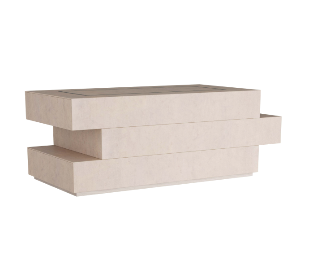 INSPIRED BY VINTAGE LACQUERED TABLES, OUR LOW-PROFILE WILKINSON COCKTAIL TABLE IMPARTS A ’70S VIBE. THE PIECE, WITH A STACKED, OFFSET COMPOSITION, IS CRAFTED IN GREIGE MAPLE VENEER, DETAILED WITH A BRONZE-IRON SURFACE INLAY. THE SAVVY DESIGN INCORPORATES THREE HIDDEN DRAWERS FOR ADDED FUNCTION. FINISH WILL VARY.